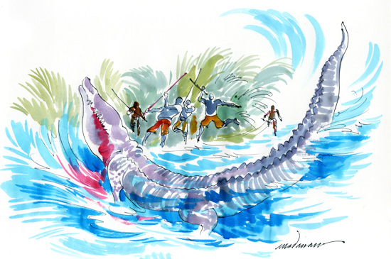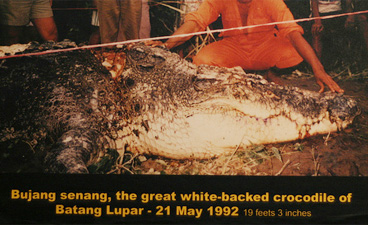 ഞാനൊരിക്കല് ഇവിടുത്തെ മുതലവേട്ടയെക്കുറിച്ചുള്ള സാഹസികമായ ഒരു കഥ കേള്ക്കുകയുണ്ടായി. ബോര്ണിയയുടെ മലേഷ്യന് ഭാഗത്താണ് സംഭവം നടന്നത്. അവിടെ വളരെ വലുതും പ്രായമേറിയതുമായ ഒരു മുതലുയുണ്ടായിരുന്നു. അതിനെ നാട്ടുകാര് ബുജാംഗ് സെനാംഗ് (സന്തുഷ്ടനായ അവിവാഹിതന്) എന്ന് പേരിട്ട് വിളിച്ചിരുന്നു. നൂറിലധികം വര്ഷങ്ങള് അത് ജീവിച്ചിരുന്നുവെന്ന് പറയപ്പെടുന്നു. നൂറോളം മനുഷ്യരെ കൊന്നൊടുക്കിയിട്ടുണ്ടെന്നും.