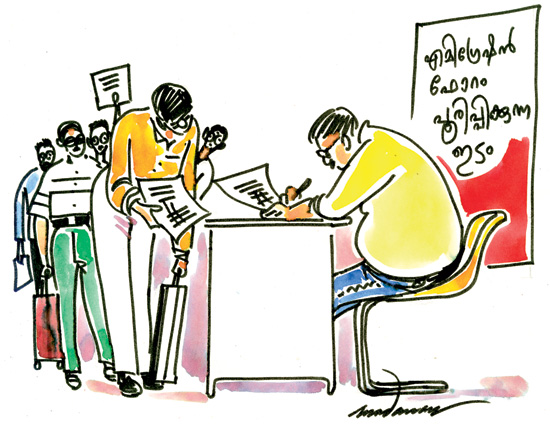 അങ്ങനെ പ്രാദേശിക ഭാഷകള്ക്കും മലയാളത്തിനും വേണ്ടി സ്വാമിമാര് മുതല് മുഖ്യമന്ത്രിവരെ നിവേദനം കൊടുക്കുന്ന സമയമാണല്ലോ. വിദേശ മലയാളികള്ക്കു വേണ്ടി എനിക്കുമുണ്ടൊരു നിവേദനം. കഴിഞ്ഞ മാസം അവസാനം ഞാന് കേരളത്തില് വന്നിട്ട് രാത്രി രണ്ടു മണിക്ക് ദോഹയിലേക്കുള്ള വിമാനത്തിനായി നെടുമ്പാശ്ശേരിയില് വന്നു. ചെക്കിങ് കഴിഞ്ഞ് എമിഗ്രേഷന് ഫോം പൂരിപ്പിക്കുന്ന എന്റെ അടുത്തേക്ക് ഒരാള് വന്നു.