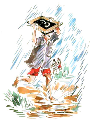മഴക്കാലത്ത് ചേമ്പിലകള്ക്കൊപ്പം സ്ലേറ്റൊരു കുടയാകും.ചാറ്റല്മഴയിലൂടെ സ്ലേറ്റ് ചൂടിയോടുമ്പോള് ഗൃഹപാഠമായ 'പറ'യും 'പന'യും വഴിലെവിടെയോ ഒലിച്ചുപോകും.