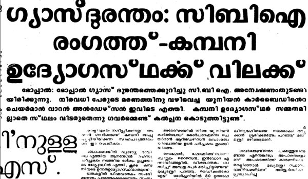 ഭോപ്പാല് ദുരന്തം സിബിഐ അന്വേഷിച്ചു. തെളിവുകള് നശിപ്പിക്കാതിരിക്കാന് കമ്പനി നേരത്തെ തന്നെ സര്ക്കാര് അടച്ചുപൂട്ടി. ആന്ഡേഴ്സനോട് സിബിഐ ഉദ്യോഗസ്ഥരുടെ സമ്മതമില്ലാതെ രാജ്യം വിടരുതെന്ന നിര്ദ്ദേശവും നല്കി.