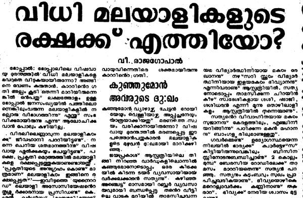 ഭോപ്പാലില് ദുരന്തമുണ്ടായ സമയത്തെ മലയാളികളെ കുറിച്ചുള്ള റിപ്പോര്ട്ട് വായിക്കാന് ഇവിടെ ക്ലിക്ക് ചെയ്യുക