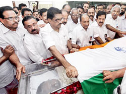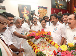 തിരുവനന്തപുരം: മുദ്രാവാക്യംവിളികളോടെ പ്രിയ നേതാവിന്റെ ഭൗതികശരീരം ഇന്ദിരാഭവന് ഏറ്റുവാങ്ങി. മുതിര്ന്ന നേതാക്കള് ചേര്ന്ന് മൃതശരീരത്തില് പാര്ട്ടിപതാക പുതപ്പിച്ചു. വികാരവായ്പോടെ യാത്രയാക്കി. ഞായറാഴ്ച...