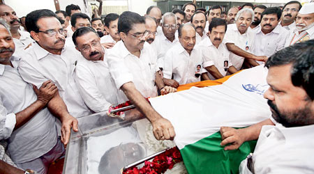 കോണ്ഗ്രസ് പ്രവര്ത്തകസമിതി അംഗം എ.കെ.ആന്റണി, എ.ഐ.സി.സി. ജനറല് സെക്രട്ടറി വീരപ്പമൊയ്ലി, വി.എം.സുധീരന്, തമ്പാനൂര് രവി, ടി.ശരത്ചന്ദ്രപ്രസാദ് , എം.എം.ഹസ്സന്, കെ.മോഹന്കുമാര് എന്നിവര് ചേര്ന്ന് മൃതദേഹത്തില് പാര്ട്ടിപതാക പുതപ്പിച്ചു.