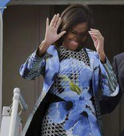 ന്യൂഡല്ഹി: ബരാക്ക് ഒബാമയ്ക്കൊപ്പം ഭാര്യ മിഷേല് ഇന്ത്യയിലെത്തിയത് ഇന്ത്യന് വംശജന് പ്രത്യേകമായി ഡിസൈന് ചെയ്ത ഫ്രോക്കും ധരിച്ച്. നീല പൂക്കള് ആലേഖം ചെയ്ത മുട്ടോളമെത്തുന്ന ഫ്രോക്ക് മിഷേലിനു വേണ്ടി...