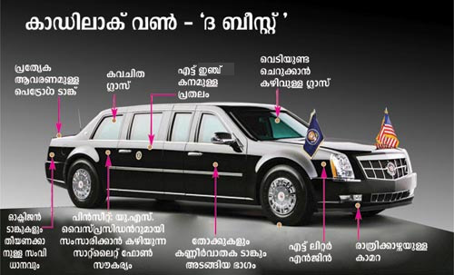 2012-ല് ഒബാമ ഇന്ത്യ സന്ദര്ശിച്ചപ്പോള് അദ്ദേഹം സഞ്ചരിച്ചത് കറുത്ത 'മെഴ്സിഡസ് ബെന്സ് എസ് 600' കാറിലായിരുന്നു. റിപ്പബ്ലിക് ദിനാഘോഷത്തിനെത്തുന്ന മുഖ്യാതിഥി രാഷ്ട്രപതിയുടെ കാറില് വന്നിറങ്ങണമെന്നാണ് ഔദ്യോഗികചട്ടം. പ്രസിഡന്റ് പ്രത്യേക വാഹനത്തിലേ സഞ്ചരിക്കാവൂവെന്നാണ് അമേരിക്കയുടെ ചട്ടം. എന്നാല്, റിപ്പബ്ലിക് ദിനാഘോഷച്ചടങ്ങില് ഒബാമ ഏത് കാറില് വന്നിറങ്ങുമെന്ന് ഇനിയും വ്യക്തമായിട്ടില്ല.