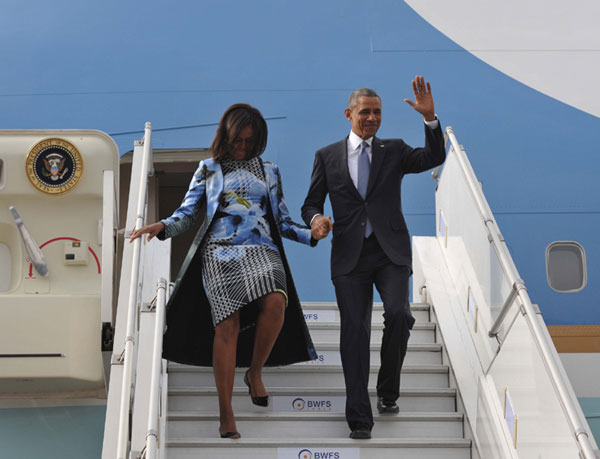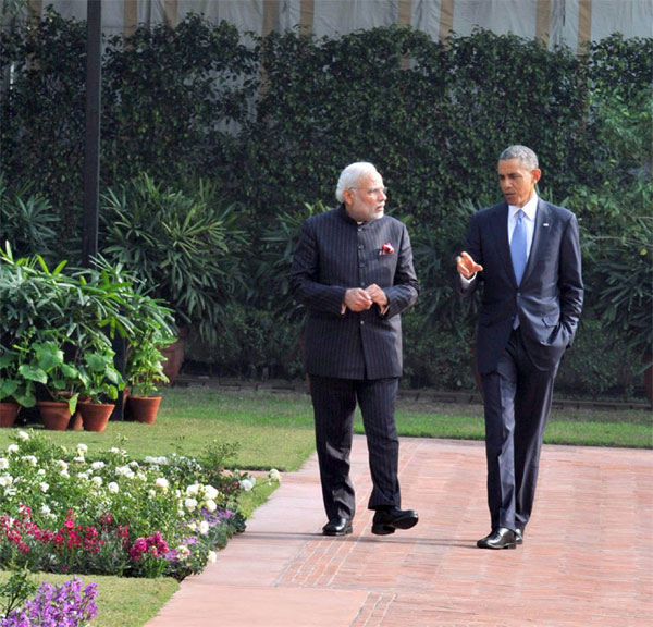 കാലത്ത് 9.45നാണ് ഭാര്യ മിഷേലിനൊപ്പം പാലം വിമാനത്താവളത്തില് അദ്ദേഹം എത്തിയത്. പ്രധാനമന്ത്രി നരേന്ദ്ര മോദി ആലിംഗനം ചെയ്ത് ഇന്ത്യയിലേയ്ക്ക് അദ്ദേഹത്തെ സ്വീകരിച്ചു. അല്പനേരം ഹോട്ടല് മൗര്യയില് വിശ്രമിച്ചശേഷം രാഷ്ട്രപതി ഭവനിലെത്തിയ ഒബാമയ്ക്ക് ഗണ് സെല്യൂട്ട് നല്കി. ഇതിനുശേഷമായിരുന്നു രാജ്ഘട്ട് സന്ദര്ശനം. ഉച്ചയോടെ ഹൈദരാബാദ് ഹൗസില് മോദിയും ഒബാമയും തമ്മിലുള്ള കൂടിക്കാഴ്ച അരങ്ങേറി.