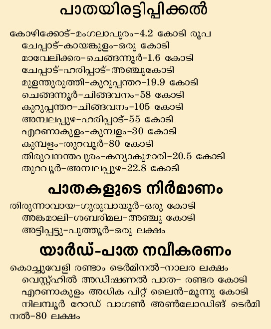 കൊല്ലം-വിരുദനഗര് ഗേജ് മാറ്റത്തിന് 86 കോടി രൂപയും ദിണ്ടിഗല്-പൊള്ളാച്ചി-പാലക്കാട് പാതയുടെ ഗേജ് മാറ്റത്തിന് നൂറു കോടിയും ബജറ്റില് വകയിരുത്തിയിട്ടുണ്ട്. തിരുന്നാവായ-ഗുരുവായൂര് പാതയ്ക്ക് ഒരു കോടിയും അങ്കമാലി-ശബരിമല പാതയ്ക്ക് അഞ്ചുകോടിയും മാത്രമാണ് നീക്കിവെച്ചത്.
