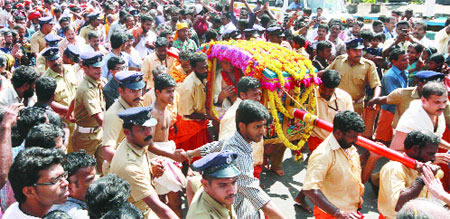 പന്തളം: കര്പ്പൂര ദീപപ്രഭയില് പരമ്പരാഗത ചടങ്ങുകളോടെയാണ് തിരുവാഭരണ ഘോഷയാത്ര തുടങ്ങിയത്. മേല്ശാന്തി ശ്രീകോവിലില് പൂജിച്ച ഉടവാള് വലിയരാജാവ് രേവതി തിരുനാള് പി. രാമവര്മരാജയ്ക്ക് നല്കി. വലിയ രാജാവ് തന്റെ പ്രതിനിധി മകംനാള് ദിലീപ്വര്മരാജയ്ക്ക് ഉടവാള് കൈമാറി ഭസ്മംനല്കി അനുഗ്രഹിച്ചു.