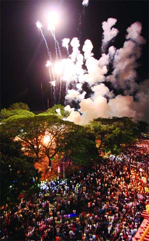 പൂരനഗരിയിലെ മാനത്ത് വെടിക്കെട്ടുവര്ണ്ണങ്ങള് മഴവില്ലുകള് തീര്ത്തു. പൂരാവേശത്തിലേക്ക് തട്ടകവാസികളെ പിടിച്ചുയര്ത്തിയ സാമ്പിള് വെടിക്കെട്ട്. മേളഗോപുരംപോലെ സാവധാനം തുടങ്ങി കൂട്ടപ്പൊരിച്ചിലിലേക്ക് കടന്നപ്പോള് ആളുകള് ആര്പ്പുവിളികളോടെ എതിരേറ്റു.