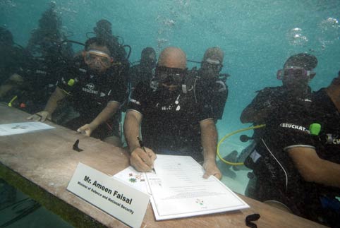 ആഗോളതാപനം ചെറുക്കാന് ഹരിതഗൃഹവാതകങ്ങളുടെ വ്യാപനം കുറയ്ക്കാന് ലോകരാഷ്ട്രങ്ങളെ ആഹ്വാനം ചെയ്യുന്ന രേഖയില് കടലിനടിയില് വെച്ച് മന്ത്രിസഭ ഒപ്പുവെച്ചു. 'ഇത് മാലെദ്വീപിനെ മാത്രം ബാധിക്കുന്ന പ്രശ്നമല്ല, ലോകത്തെ മുഴുവന് ബാധിക്കുന്നതാണ്'പ്രസിഡന്റ് നഷീദ് പറഞ്ഞു. 11 മന്ത്രമാരും പ്രസിഡന്റും വൈസ്പ്രസിഡന്റും ക്യാബിനറ്റ് സെക്രട്ടറിയും രേഖയില് ഒപ്പുവെച്ചു.