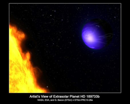 HD 189733b എന്ന നാമത്തില് അറിയപ്പെടുന്ന വിദൂരലോകത്തെ ഗ്രഹത്തിനാണ് നീലനിറമുള്ളതായി മനസിലാക്കിയത്. ഗ്രഹാന്തരീക്ഷത്തിലെ സിലിക്കേറ്റ് മഴ മൂലമുള്ള പ്രകാശത്തിന്റെ വിസരണമാണ് ഗ്രഹത്തിന് നീലനിറം നല്കുന്നതത്രേ.